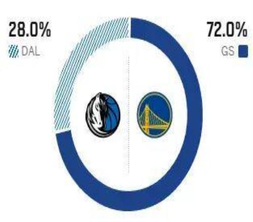 美媒ESPN预测本场比赛,勇士胜率为72%,独行侠胜率为28%。