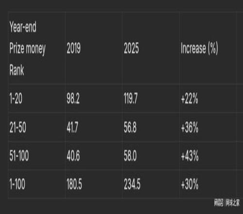 在过去六年里,ATP前20名球员的奖金仅增长了22%。但从2019年11月到2025年11月,美元通胀率达到了26%。这意味着,世界顶级球员的实际收入反而低于2019年。