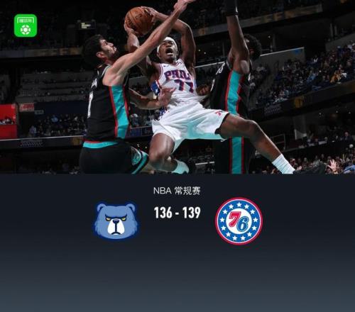 加时赛,上来灰熊连续反击迅速领先4分,随后76人乔治、恩比德站出来反超比分,灰熊还是莫兰特站出来冲框追平比分,最后时刻76人埃奇库姆三分准绝杀,最后1.7秒灰熊考沃德三分不中,最终灰熊136-139不敌76人。