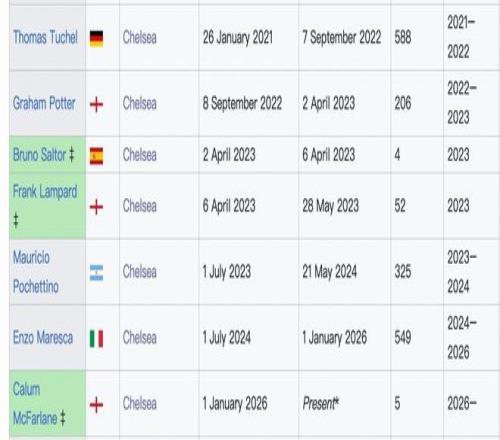 在任时间5天,战绩为1平,胜率0%,据悉麦克法兰还将指挥切尔西客战富勒姆的比赛
