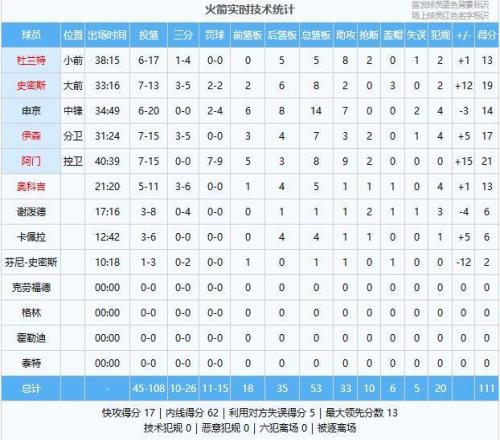 火箭:阿门21分8板9助2断、史密斯19分8板2助3帽、伊森17分7板3助2断、申京14分14板7助、杜兰特13分5板8助2断、奥科吉13分5板1助、卡佩拉6分4板1助、谢泼德6分1板1助2断