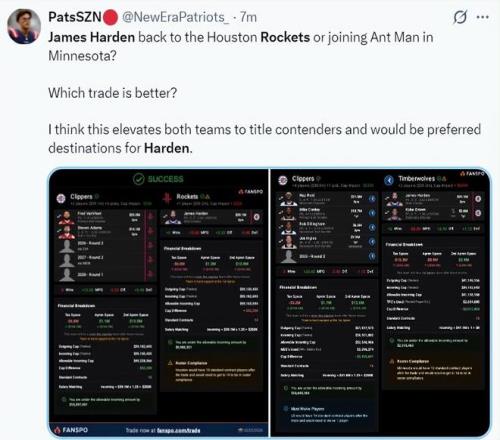 火蜜纷纷发声乐意看到哈登回归!休媒晒巅峰照欢迎:模拟5换1方案