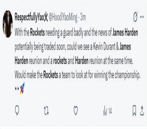 哈登可能重返休斯顿的消息出炉后,火箭球迷们纷纷发声:火箭急需一名控球后卫,哈登即将被交易的消息传出,我们有机会看到杜兰特、哈登第三次携手,如果这两人在休斯顿重聚,我们有希望拿到总冠军。