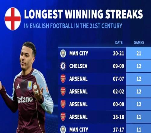 本世纪英超俱乐部各项赛事连胜纪录:曼城21连胜断档第一 -